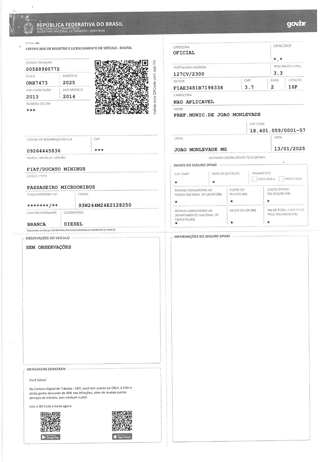 01 VEÍCULO FIAT/DUCATO MINIBUS Ano 2013 e Modelo 2014 cor Branca, placas OPM5263, Renavam 00588360774, chassi 3WAZFA4124Z35041, DIESEL. O lote descrito vai a leilão no estado e nas condições intrínsecas e extrínsecas em que se encontra.