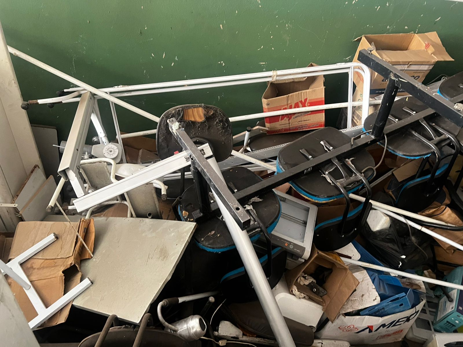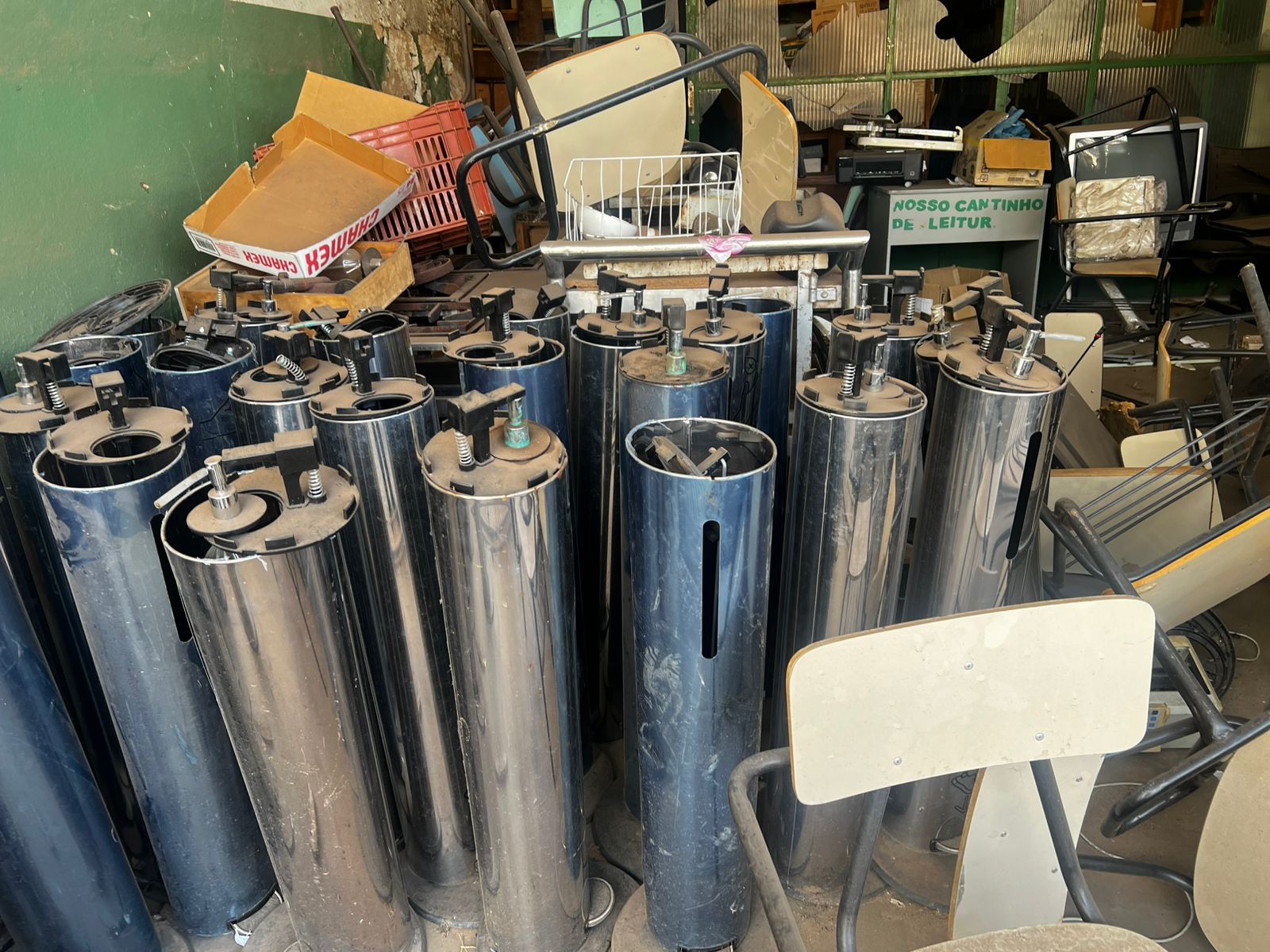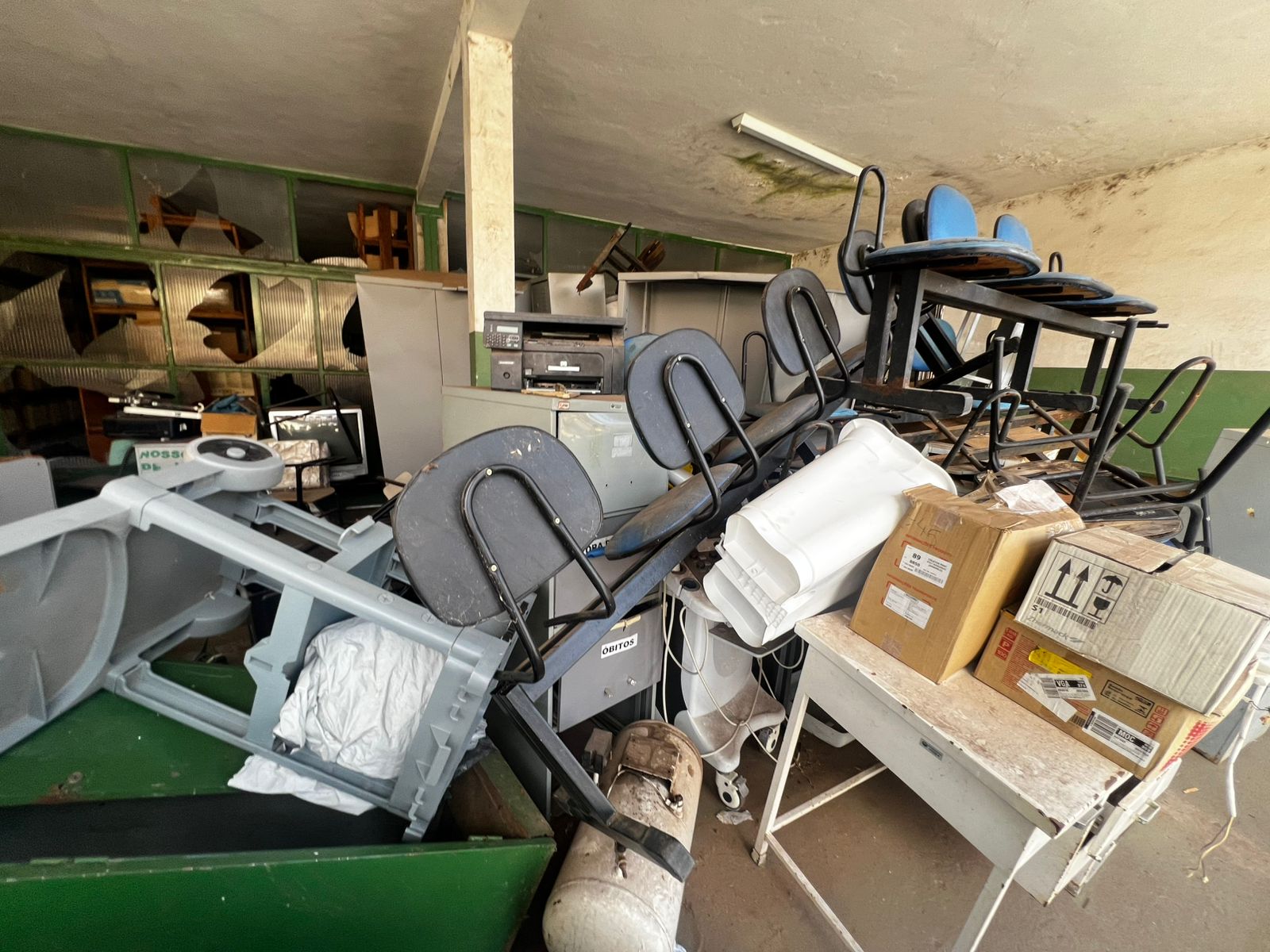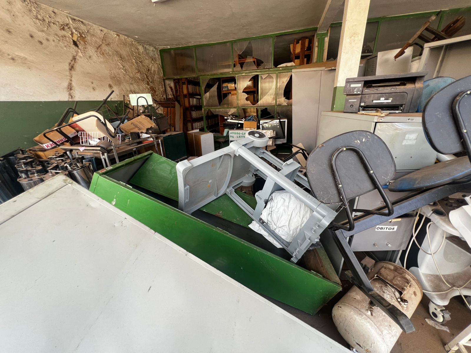 LOTE CONTENDO BENS DIVERSOS EM ESTADO DE SUCATA: MÓVEIS DIVERSOS mesas, carteiras e cadeiras, armários, arquivos em aço, mimeógrafos, longarinas, balcões, geladeiras, panelas em Inox e alumínio entre outros; MÓVEIS E EQUIPAMENTOS HOSPITALARES E ODONTOLÓGICOS DIVERSOS entre outros, INFORMÁTICA cpu´s, monitores, mouses, teclados, estabilizadores, nobreak, impressoras, equipamentos de telefonia diversos entre outros; ELETROELETRONICOS DIVERSOS Tv´s, aparelhos eletrônicos,  aparelhos de som,  entre outros. O lote acima vai a leilão no estado de sucata cuja finalidade é reciclagem e reaproveitamento peças e matéria-prima, nas condições intrínsecas e extrínsecas em que se encontram.